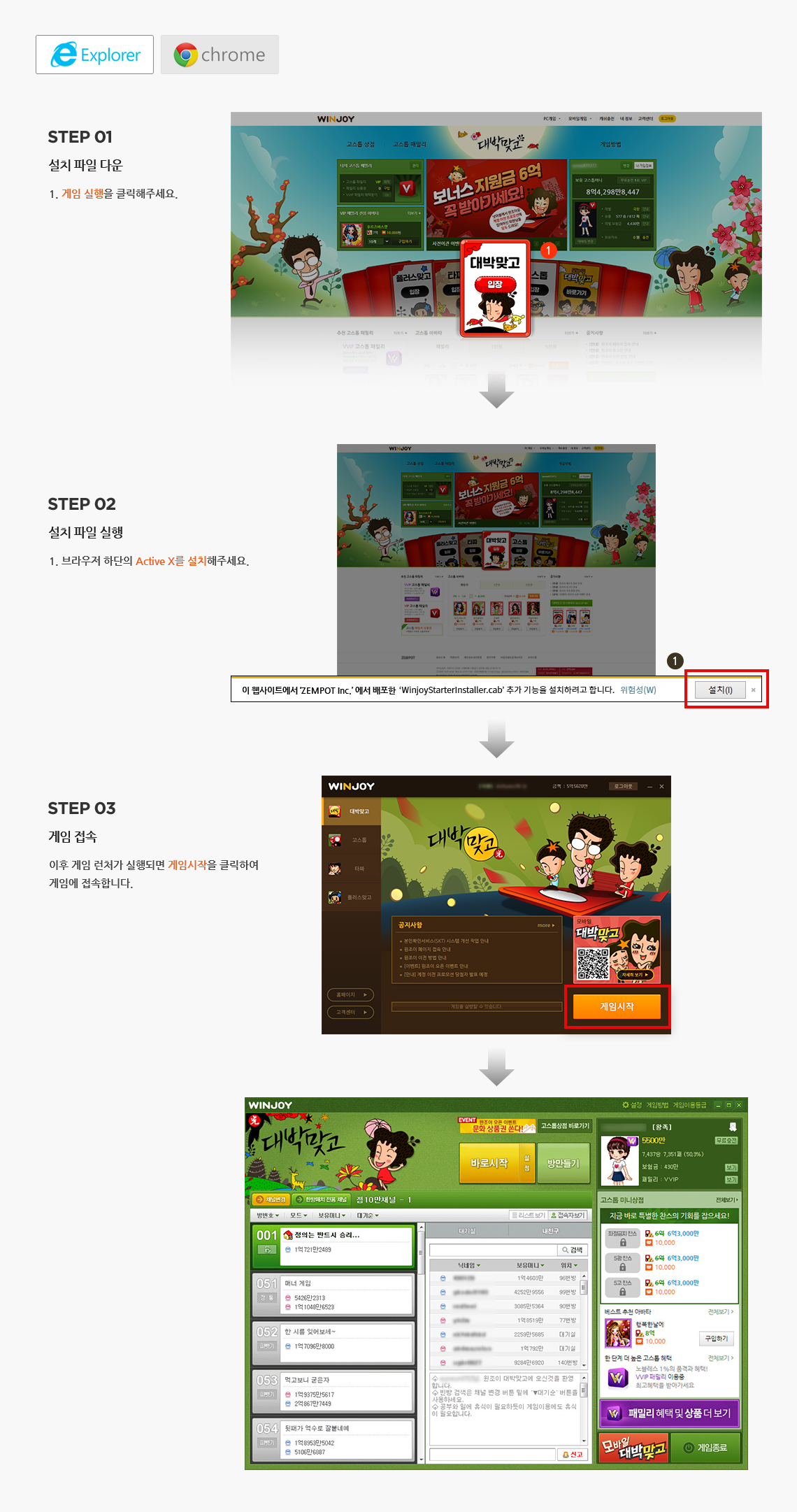 컴퓨터에 대박맞고가 설치되어 있지 않은 경우, 아래와 같은 윈조이 스타터 > 고스톱 런처 > 게임 설치 순서로 진행됩니다.