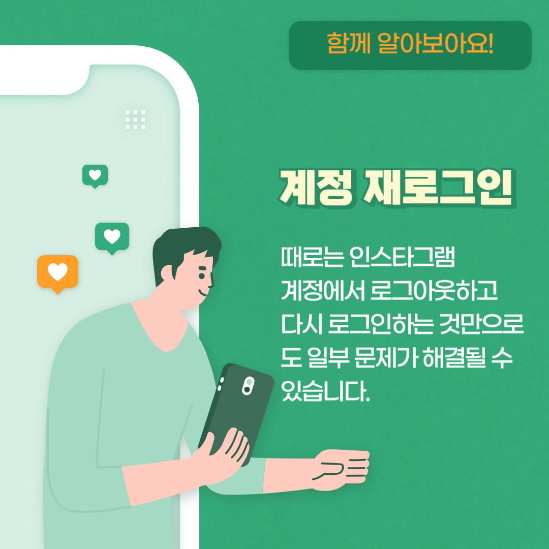 계정 재로그인 : 때로는 인스타그램 계정에서 로그아웃하고 다시 로그인하는 것만으로도 일부 문제가 해결될 수 있습니다.