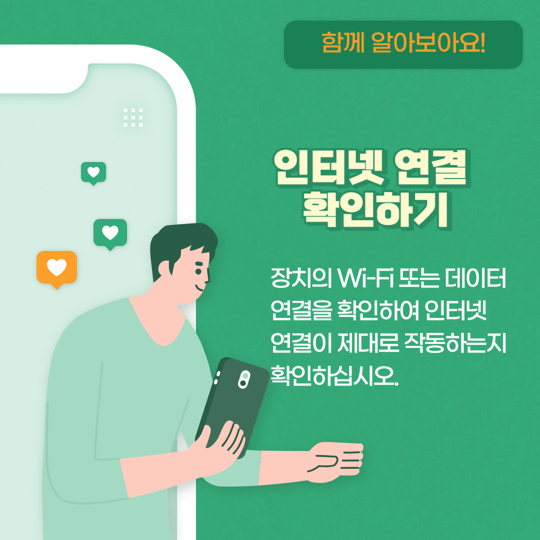 인터넷 연결 확인하기 : 장치의 Wi-Fi 또는 데이터 연결을 확인하여 인터넷 연결이 제대로 작동하는지 확인하십시오.