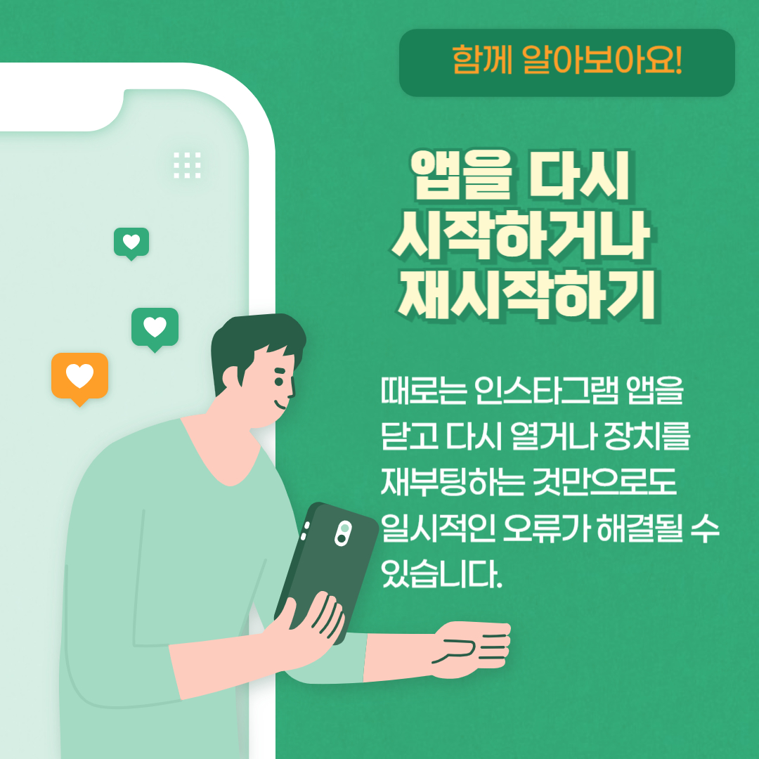 앱을 다시 시작하거나 재시작하기 : 때로는 인스타그램 앱을 닫고 다시 열거나 장치를 재부팅하는 것만으로도 일시적인