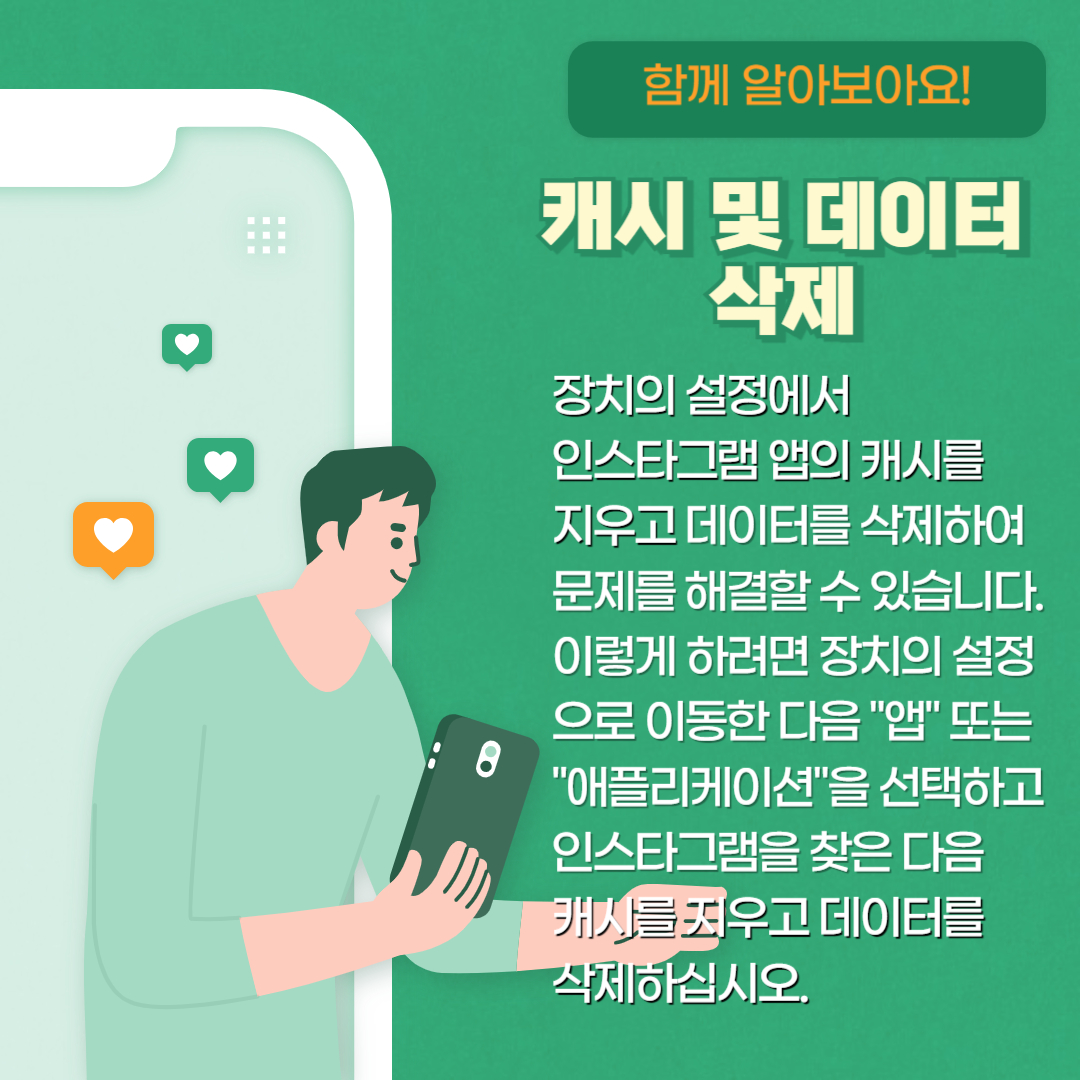 캐시 및 데이터 삭제 : 장치의 설정에서 인스타그램 앱의 캐시를 지우고 데이터를 삭제하여 문제를 해결할 수 있습니다.