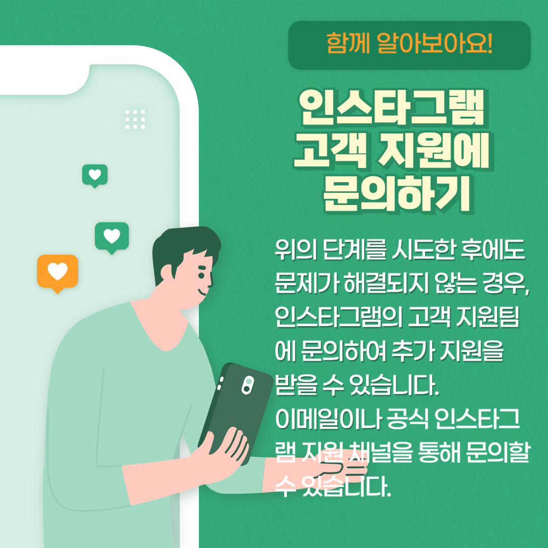 인스타그램 고객 지원에 문의하기 : 위의 단계를 시도한 후에도 문제가 해결되지 않는 경우, 인스타그램의 고객 지원팀에 문의하여 추가 지원을 받을 수 있습니다. 이메일이나 공식 인스타그램 지원 채널을 통해 문의할 수 있습니다.