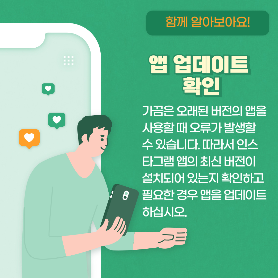 앱 업데이트 확인 : 가끔은 오래된 버전의 앱을 사용할 때 오류가 발생할 수 있습니다. 따라서 인스타그램 앱의 최신 버전이 설치되어 있는지 확인하고 필요한 경우 앱을 업데이트하십시오.