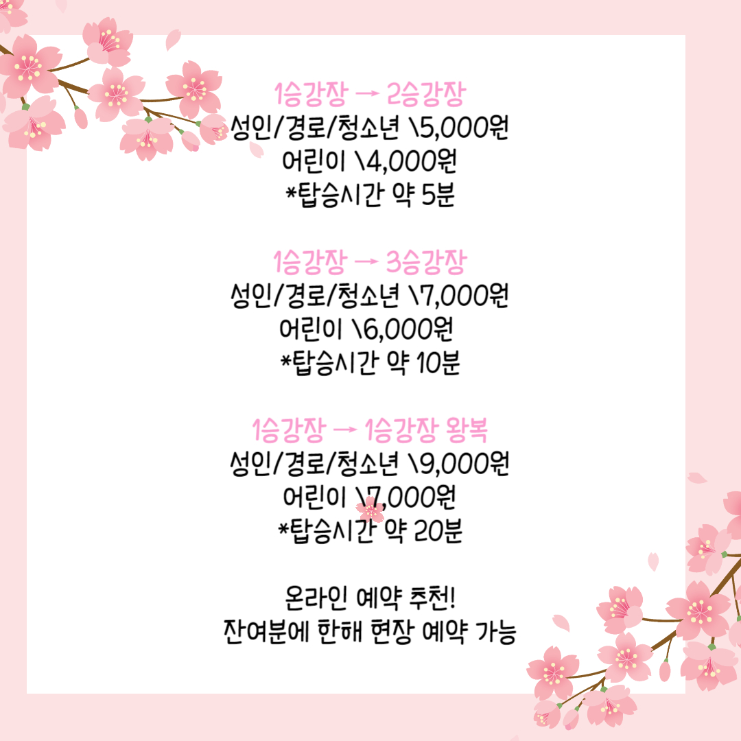 이유는 1승강장에서 2승강장으로 가는 길이 경사가 있기 떄문에 체력적으로 힘들어서 봄을 온전히 즐기기에 어려울 수 있습니다. 1구간을 이용하면 2승강장 전망대에서 하차 후 내리막을 걸을 수 있어 편안하게 봄꽃을 감상할 수 있습니다.